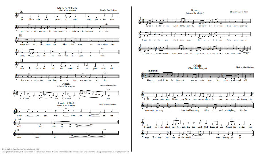 This is the melody line of the entire Mass of the Martyrs setting. To be printed as two sided 11x14 paper and folded. You may make unlimited copies to be distributed and used by the congregation.